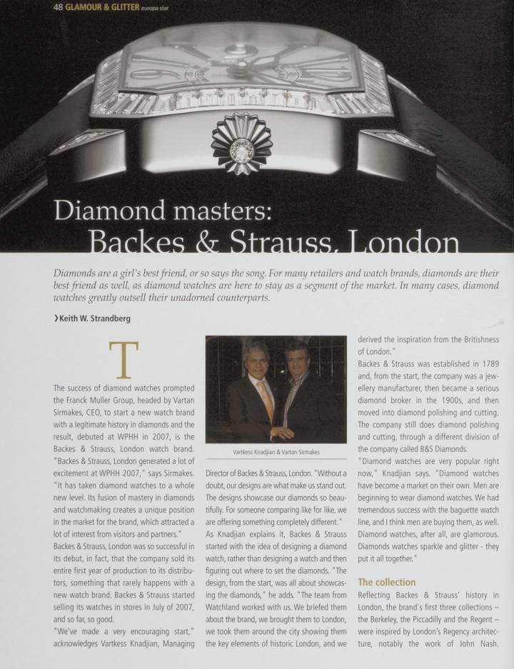 En 2003, el CEO de Backes & Strauss, Vartkess Knadjian, dio la bienvenida a un nuevo cliente de la industria relojera Suiza: Franck Muller. «Nos llevamos bien», recuerda el experto en diamantes. «La compañía fue un ’disruptor’ en la industria relojera. Y pensamos que tendría sentido, para una marca como Backes & Strauss que tiene una larga herencia en diamantes, salir con una colección de relojes con diamantes.»