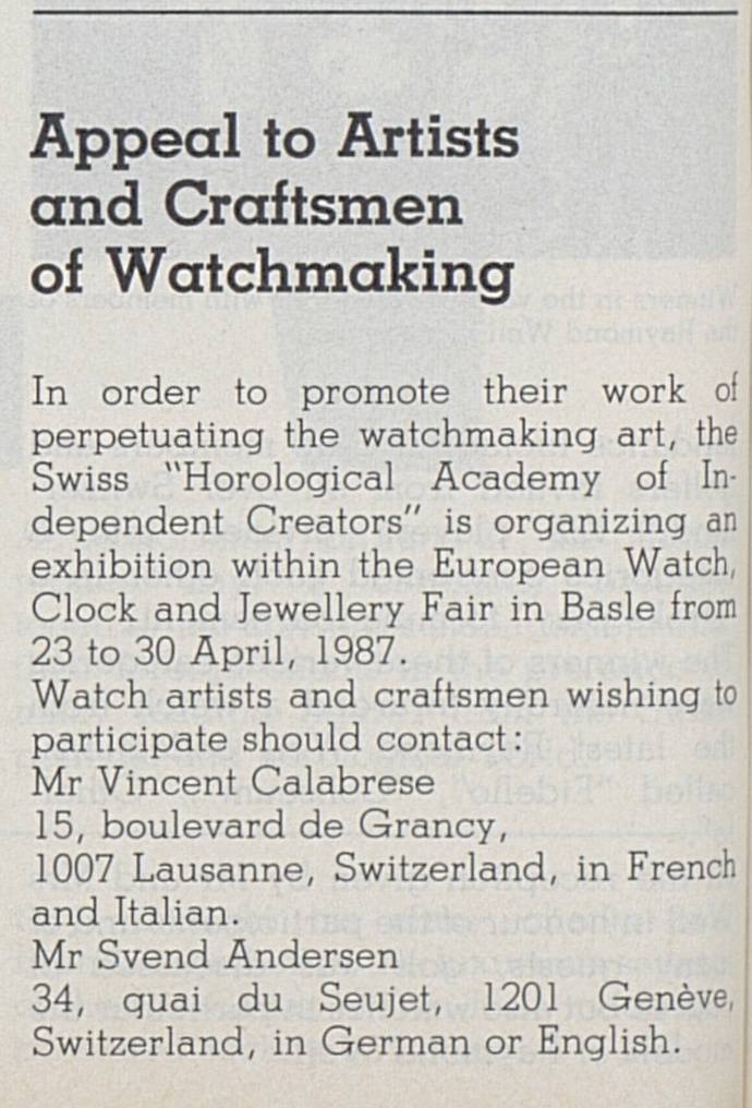 - Un año después de su creación en 1985, la Académie Horlogère des Créateurs Indépendants, co-fundada por Svend Andersen y Vincent Calabrese, anunció que expondría en la Feria de Basel.