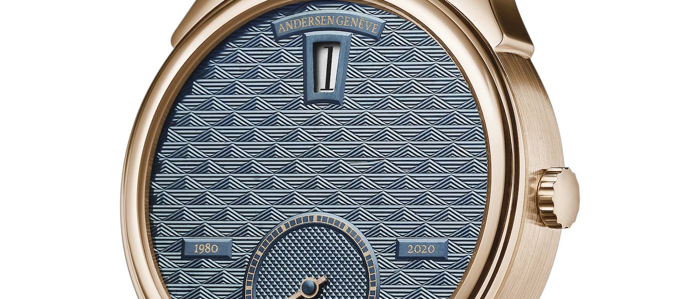 En 2020, Andersen Genève presentará un nuevo reloj de horas de salto para celebrar su 40 aniversario. Este reloj ha sido fabricado con la ayuda de artesanos que son maestros en sus respectivos campos. La esfera “Magical Lozenges” guilloché en oro azul de 21 quilates es extremadamente difícil de fabricar: requiere que el artesano trabaje con tres máquinas diferentes para lograr este nivel de detalle. El resultado es una superficie que produce un efecto visual diferente según el ángulo en el que la luz incida.