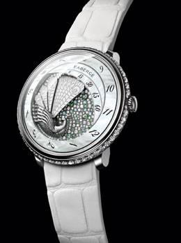 Nunca antes había visto a Jean-Marc Wiederrecht, creador de Agenhor, la celebre fabricante de movimientos multi-galardonada, y un especialista en los movimientos retrógrados y poéticos (especialmente para Van Cleef & Arpels), tan emocionado y entusiasta. «Me parece que soy libre para crear, como nunca antes, es fantástico, puedo empezar a aplicar mis ideas más locas...» ¿Cual es esta oportunidad de oro? «¡Fabergé, por supuesto! El departamento de relojería ha sido tomado por una mujer joven, Aurélie Picaud, y es simplemente fabuloso...» Y es cierto que el bullicio en torno a las nuevas creaciones relojeras de Fabergé continuó creciendo a lo largo de Baselworld. El primer objeto de entusiasmo de Jean-Marc Wiederrecht se llama simplemente Lady Compliquée. ¿Y que es?, es una complicación encantadora, ultra-femenina, que consta de un abanico que se abre gradualmente en el transcurso de 60 minutos, al final del cual se cierra de golpe, antes de comenzar el ciclo de nuevo. Este reloj, con su rostro siempre cambiante, en la actualidad. existe en dos versiones: un abanico de hielo que se abre a través de un paisaje nevado de madreperla, y un pavo real que abre su cola antes de cerrarla de nuevo. Este impresionante reloj ha puesto en marcha por cuenta propia una nueva era de relojería en Fabergé. Europa Star volverá a Fabergé en una fecha posterior. |