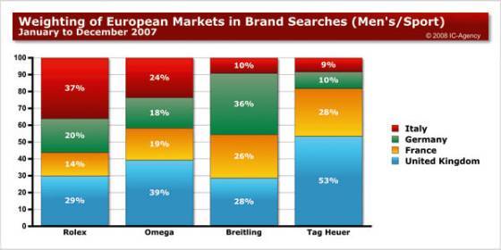 TAG Heuer recibe la mayoría de sus consultas desde el Reino Unido (53%) y Francia (28%). Se deduce que esta marca podría fácilmente