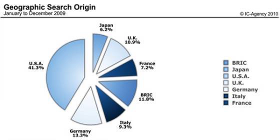 Según los resultados preliminares del estudio de mercado, casi el 12 por ciento de las consultas de búsqueda para las 25 marcas incluidas en el estudio WorldWatchReport proceden de los mercados BRIC. China lidera con un 59 por ciento la demanda de los países BRIC, seguido por Brasil con el 20 por ciento, y Rusia y la India vienen seguidamente con un 13 por ciento y 8 por ciento, respectivamente. En comparación con Estados Unidos o Europa, que envian el 41,3 por ciento y el 40,9 por ciento de la demanda mundial, respectivamente, estas cifras dan fe de una demanda latente significativa de la clientela de relojes de lujo en los países BRIC, demanda que debe ser captada por las marcas.