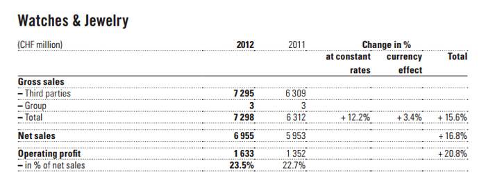 El segmento de Relojes y Joyería vio un aumento significativo en las ventas. Las ventas brutas ascendieron a 7.298 millones de CHF, un 15,6% más que en el 2011. Todas las marcas contribuyeron a este buen resultado, con la gama alta y los segmentos de rango medio de precios registrando un crecimiento muy fuerte. En términos geográficos, el crecimiento de las ventas se distribuyen en todos los continentes, en particular fuera de la zona de la China Continental, como Europa, Estados Unidos Rusia y el Medio Oriente.