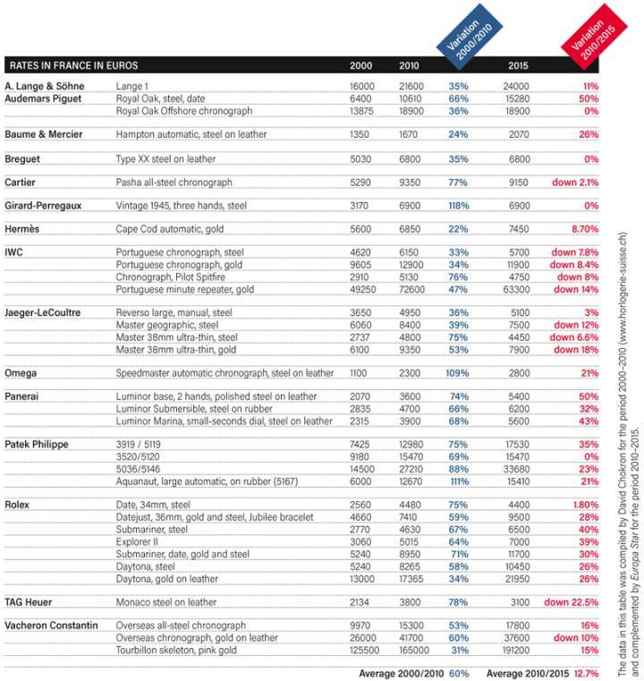 Nota: por supuesto, los datos brutos en esta tabla deben ponderarse para el general aumento del coste de la vida, los tipos de cambio, las fluctuaciones en el precio de los materiales, etc. A modo de indicación, la inflación media en Francia se situó en el 27% entre 2000 y 2010 y 7% entre 2010 y 2015.