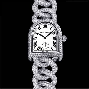 El fuerte énfasis en el mundo de safari, en el que Ralph Lauren puede reclamar la mayor legitimidad, está orientada hacia el cliente masculino en cuanto a los relojes de la marca se refiere. Pero en el extremo más exclusivo del espectro, Ralph Lauren también ha introducido un trío de impresionantes modelos de joyería para damas para el 2013. La colección Stirrup ahora incluye una pieza de joyería, el Stirrup Diamond Link que está adornado con 1.911 diamantes de 20 tamaños diferentes para un asombroso total de alrededor de 35,58 quilates. El caja entera, que mide 32.40mm por 34.30mm, así como los eslabones de la cadena del brazalete, todo en oro blanco de 18 quilates - están engastados con diamantes. La corona, también de oro blanco de 18 quilates, está engastada con un diamante en talla rose de 0,38 quilates. Frente a este telón de fondo brillante, la esfera sigue siendo el epítome del clasicismo de Ralph Lauren, con numerales Romanos negros y una pista de minutos en negro a conjunto contra un fondo de color blanco lacado y pulido. Los impulsos que mueven el segundero pequeño a las 6 en punto, proceden del calibre mecánico de carga automática de la manufactura RL701, que opera a 28.800 alternancias por hora y ofrece una reserva de marcha de aproximadamente 70 horas.