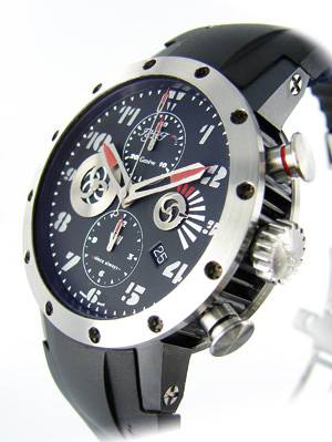 Cronógrafo de inmersión de 44,6 mm en acero inoxidable que equipa un mecanismo Soprod 7750RM. Esfera negra mate, dígitos estampados y pulimentados, manecillas en níquel cepillado, con Superluminova roja, recubrimiento de PVD en cuernos, pulsadores y corona, dos cristales de zafiro, indicador de fecha a las 4 e indicador de reserva de marcha a las 3. Montado con correa de caucho, hebilla desplegable de acero inoxidable y una rejilla de protección desmontable para inmersión. El nombre del propietario puede grabarse en la hélice del pequeño segundero.