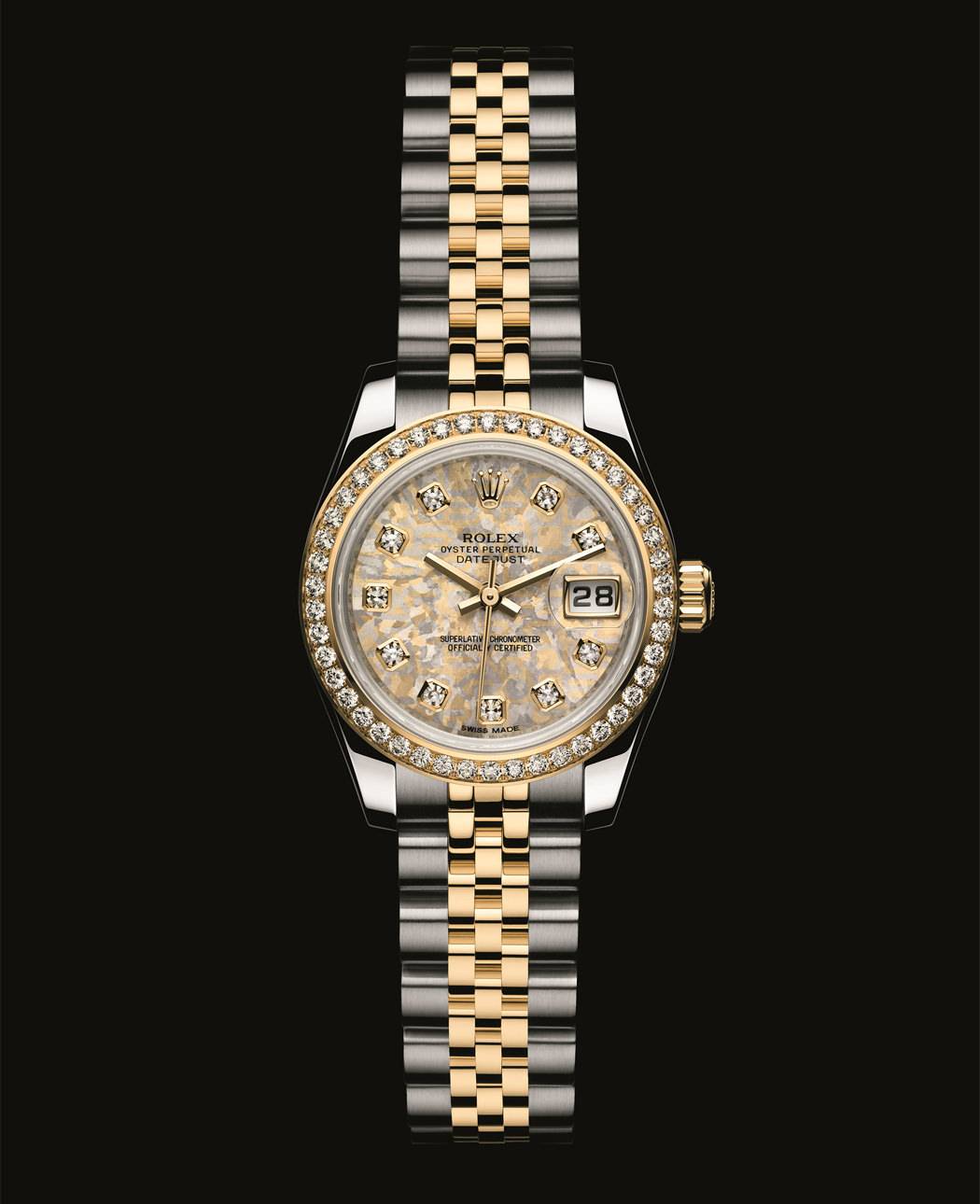 Esfera: Gold Crystals (oro amarillo de 18 ct yellow gold), motivo Rolex Jubilée en amarillo y gris, marcadores horarios en oro de 18 quilates con 10 diamantes engarzados, diamantes en el bisel y agujas en oro amarillo de 18 ct.