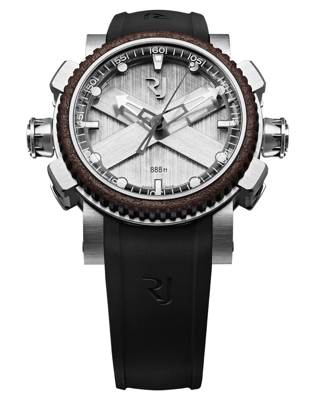 Caja: Ø46mm acero. Tornills de cabeza octogonal. Mecanismo de control de tiempo monstrando graduaciones de 5 minutos en un bisel interno rotatorio unidireccionalmente. Dos coronas atornilladas y grabadas adornadas con 8 remaches. Una corona a las 9 en punto para ajustar el reloj y una segunda corona a las 3 en punto para el bisel interno rotatorio. Un pulpo grabado estampado en el reverso de la caja.