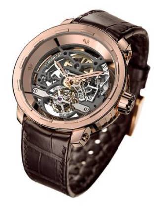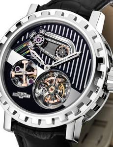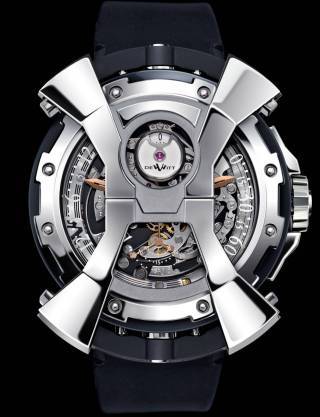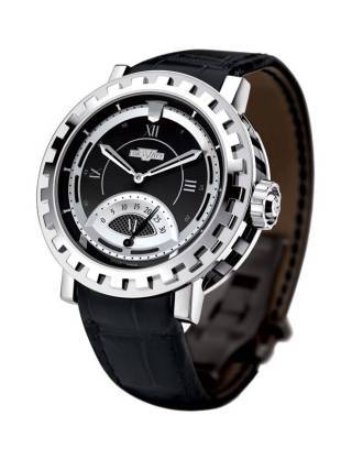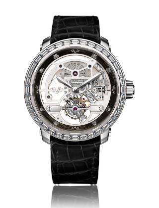 Reloj de 18 quilates de oro blanco equipado con un movimiento mecánico DW 8801 de cuerda manual sobre una base Claret con decotación Côtes de Genève. 48-horas de reserva de marcha, horas, minutos cuartos con soneria en dos tonos al girar el bisel giratorio, esfera con frente y trasera de cristal de zafiro, resistente al agua hasta 30 metros.