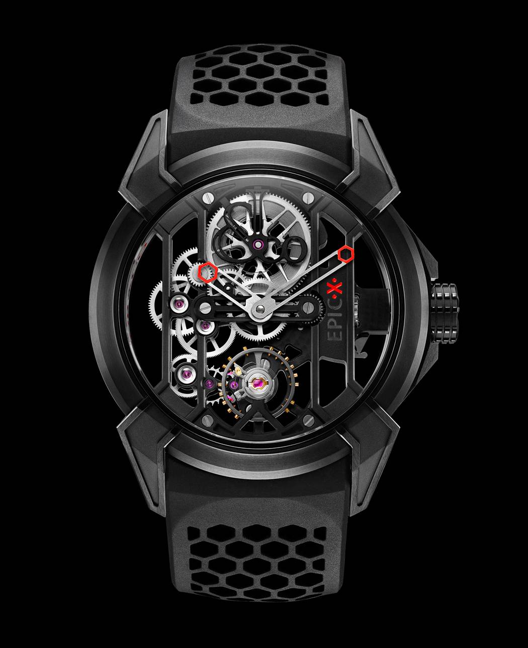 Acabados: Puente superior “Jacob & Co” upper; pulido con chorro de arena, puentes con cantos achaflanados y pulidos a mano; grabado con laca roja “Epic X” en el lado derecho del puente; mirror-polished tornillos con pulido espejo; circular: granesdo circular de los puentes en la parte trasera.