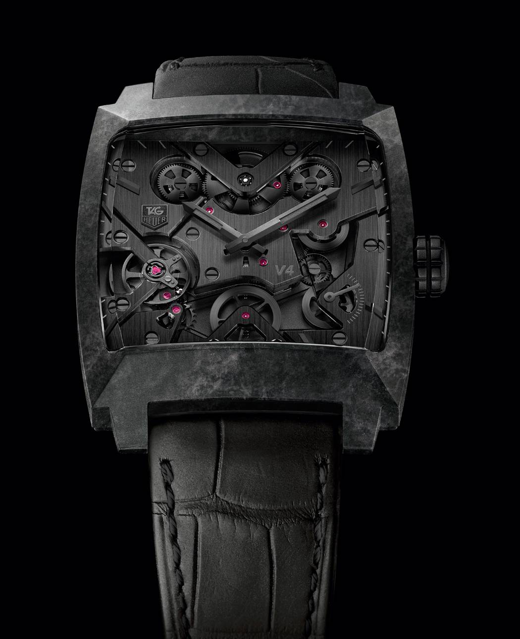 Totalmente negro. Totalmente mate. Elegante. Sin compromisos. Casi sigiloso. La caja se hace enteramente a partir de fibra de carbono, así como los siete puentes de su movimiento de leyenda, que está equipado con la famosa transmisión microscópica con una micro-correa de transmisión (del tamaño de un cabello, no mayor de 0,07 mm) con su masa lineal que se mueve en un carril y los rodamientos de bolas: demos la bienvenida al Monaco V4 Phantom.