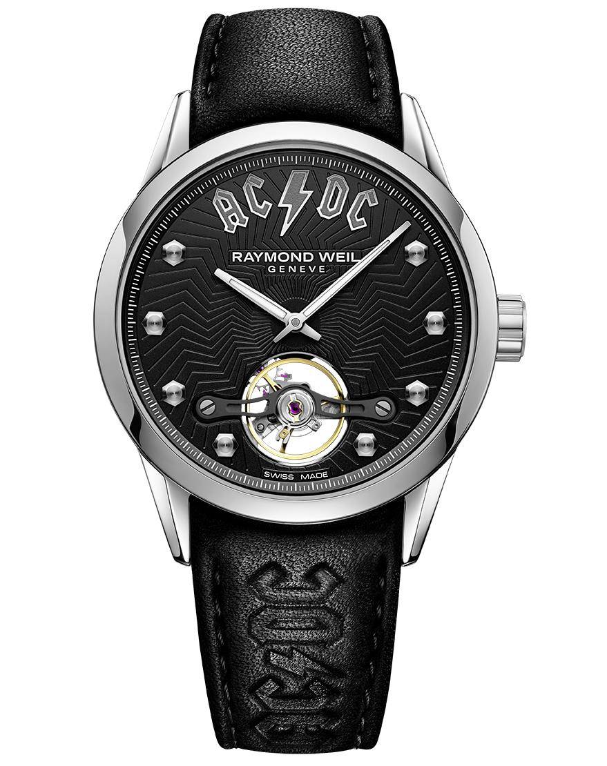 El relojero suizo de lujo, Raymond Weil, se enorgullece en anunciar una nueva colaboración en su serie Music Icons, el Freelancer AC/DC Limited Edition, en homenaje al legendario grupo miembro del Salón de la Fama del Rock and Roll, AC/DC. Movimiento Calibre RW1212, que permite a los espectadores ver el balanceo «corriente alterna/corriente continua» en el reloj. Diámetro 42mm. Edición limitada a 3.000 ejemplares.