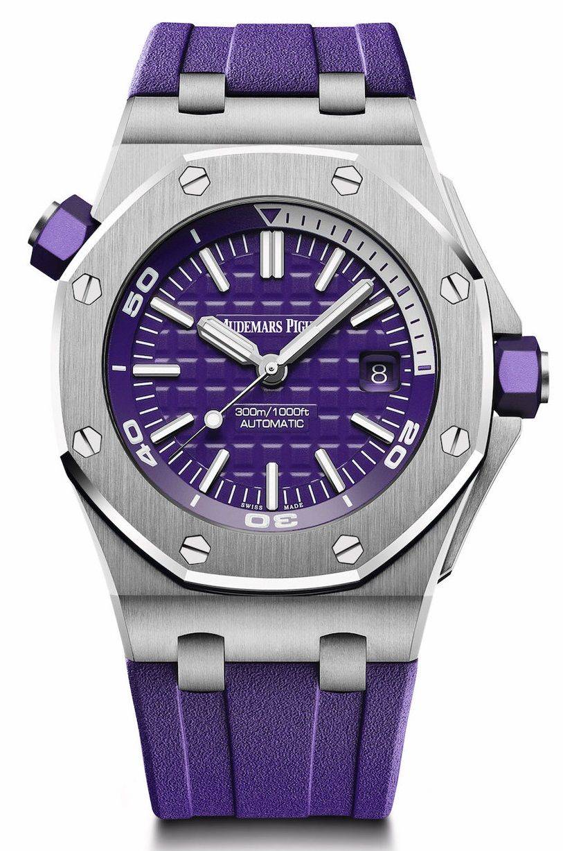 Movimiento: De cuerda automática, propio de la Manufactura Calibre 3120, reserva de marcha 60 h. Tipo de masa oscilante: Monobloque en oro de 22 quilates. Caja: Caja de acero inoxidable, cristal y fondo de zafiro antirreflejos, coronas de color púrpura con cierre de rosca. Esfera: Esfera morada con patrón «Méga Tapisserie», marcadores horarios aplicados en oro blanco y agujas Royal Oak con recubrimiento luminiscente, bisel interior giratorio morado con zona de 60 a 15 minutos en blanco.