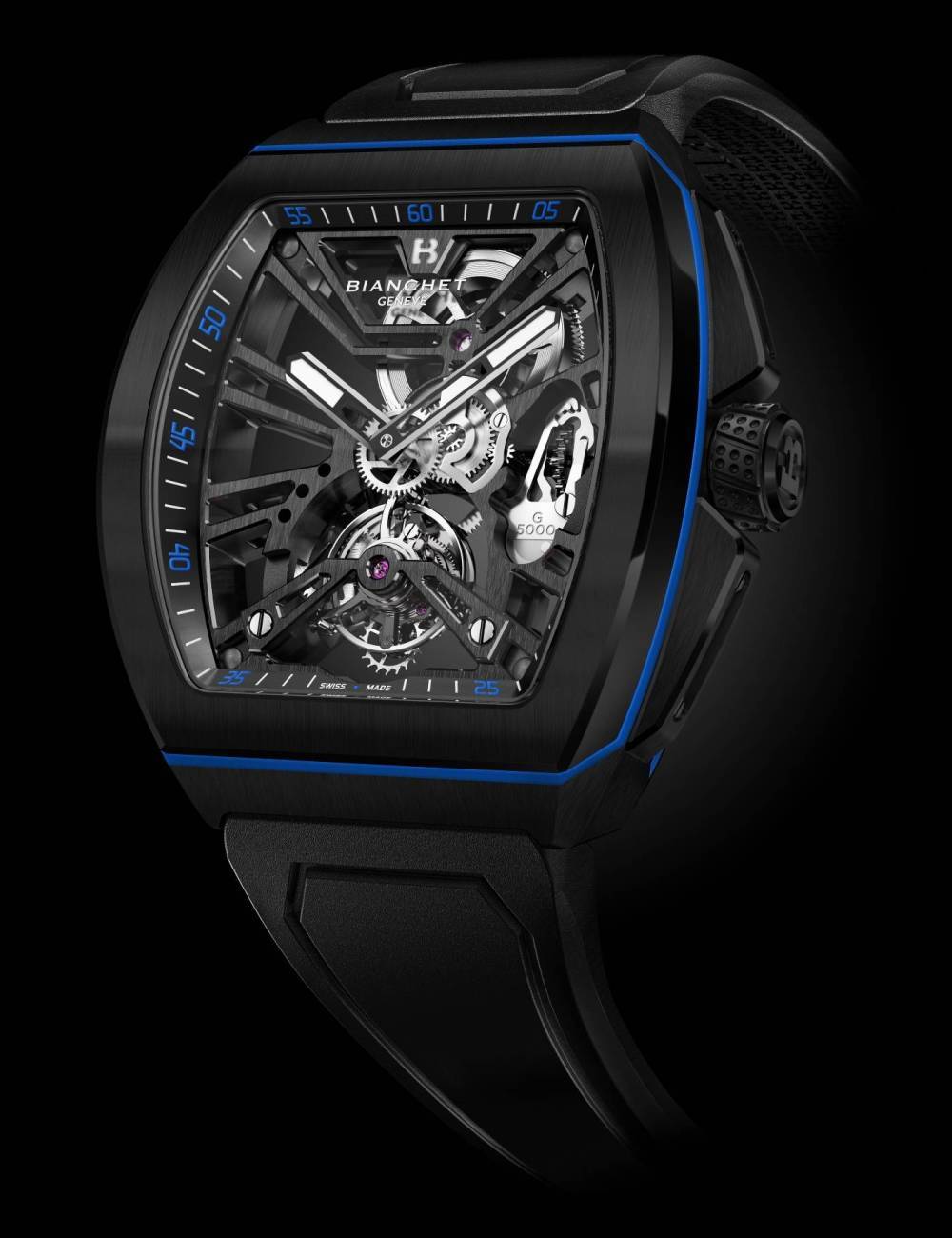 Combinando el efecto fascinante de la complicación del tourbillon mecánico con la transparencia del movimiento esqueletizado, el Bianchet G5000 Active Tourbillon es un reloj único de gama alta para un estilo de vida activo.