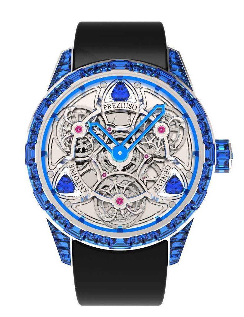 Este reloj único en oro blanco de 18 quilates contiene 233 zafiros con más de 24 quilates en total, en un raro azul real, corte baguette, montura invisible, con zafiros solitarios talla trillion flotando en la esfera, junto a los tres tourbillons.