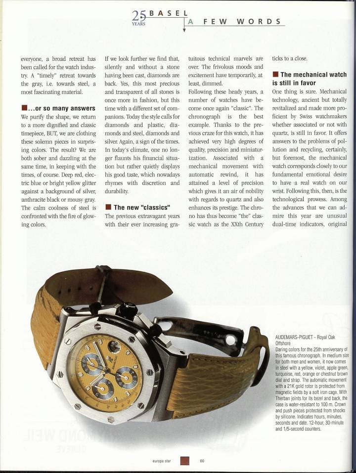 - El primer vistazo del Audemars Piguet Royal Oak Offshore en los archivos de Europa Star es una mención discreta como parte de nuestra cobertura de Basilea 93. Este fue el primer cronógrafo que llevó el nombre Royal Oak, y este fue el enfoque más que el tamaño o estilismo.