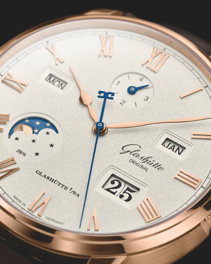 El Senator Excellence Panorama Date combina dos de las complicaciones típicas de Glashütte Original: una luna hecha a mano en color plateado o dorado traza su camino debajo de una abertura curva en la esfera. El cuidadoso fresado de diamante produce un perfil nítido, que contrasta claramente con el azul galvánico del cielo nocturno. Una generosa apertura de la esfera a las 4 enmarca el Glashütte Original Panorama Date, que se compone de dos discos de fecha montados al mismo nivel y sin barra de separación central, lo que garantiza una legibilidad óptima.