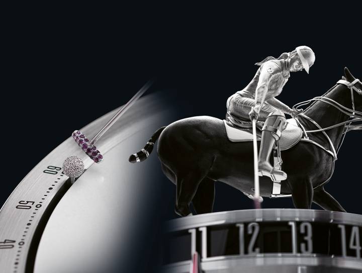 La forma del reloj está inspirada en un trofeo: la parte superior presenta a un jugador de polo sobre su caballo en el acto de golpear la pelota, mientras que el innovador mecanismo del reloj mueve la pelota de polo hacia el mazo del jugador y, en cada cambio de hora, simula el golpe del jugador al mismo tiempo que gira el anillo horario.