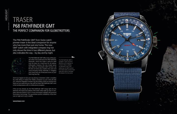 - El P68 Pathfinder GMT está disponible en verde y azul. Ya sea que se dirija al mar para relajarse o busque una descarga de adrenalina en el desierto, la función GMT del reloj Suizo pionero Traser, agrega un valor adicional a la vida cotidiana entre las zonas horarias.