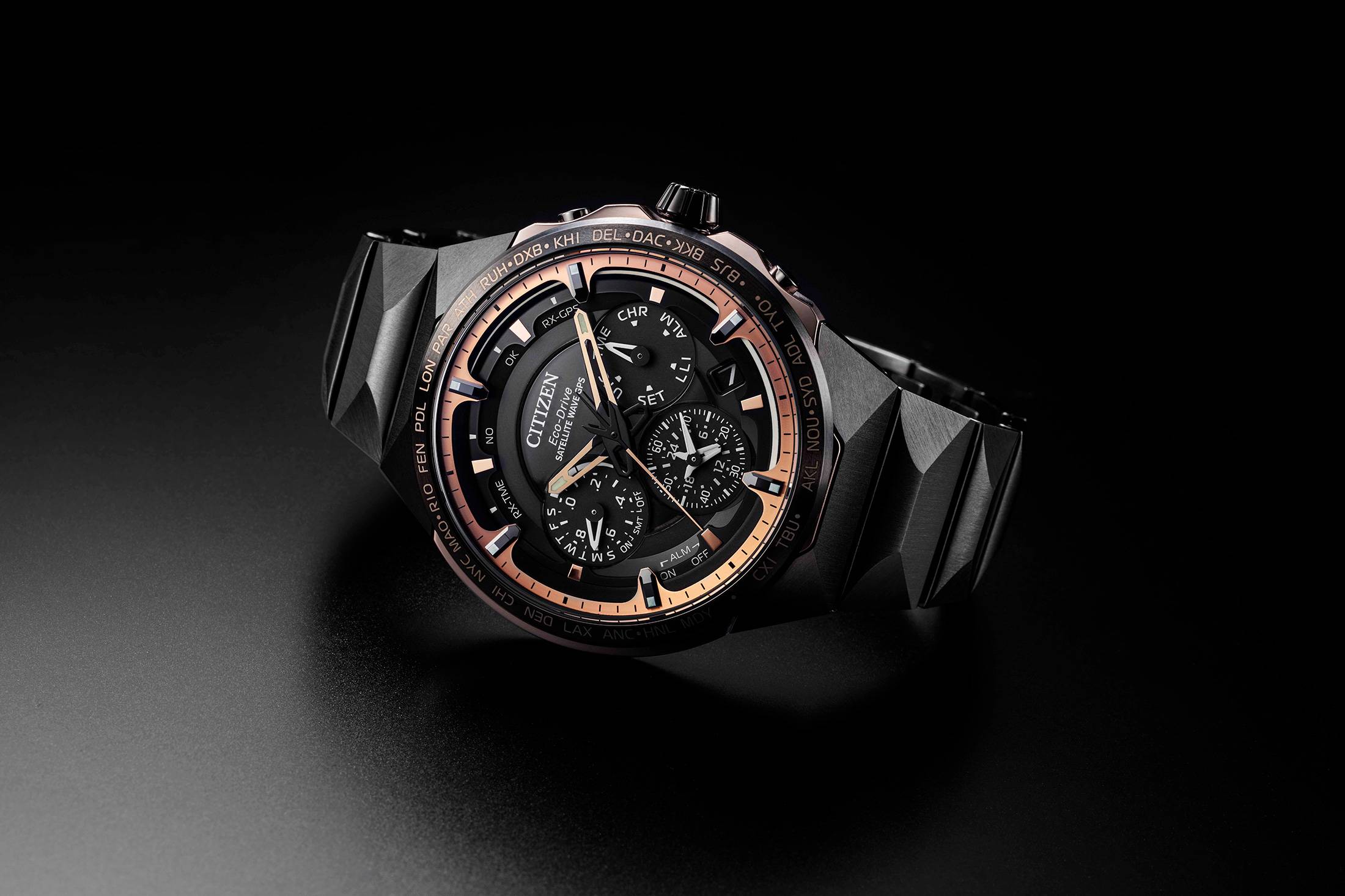 La caja (cuyo diámetro de 47.5 mm le da una presencia imponente en la muñeca) y la banda presentan líneas geométricas que forman una superficie tridimensional, creando una impresionante forma esculpida de ángulos y sombras. La esfera negra es una estructura de varias capas que comprende seis partes apiladas una encima de la otra, que evoca las profundidades insondables del espacio exterior. La calidad de la caja y el brazalete se encuentran entre las características más importantes del modelo. Consta de varias partes separables, muestran un diseño lineal y vanguardista y están recubiertas con un tratamiento Duratect de alta calidad de DLC y Sakura Pink. Como el titanio es difícil de procesar, este delicado trabajo es un testimonio de los 50 años de investigación y desarrollo de Citizen.