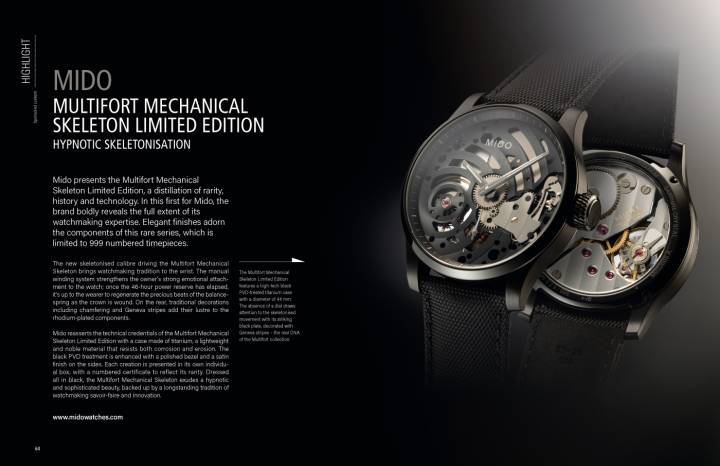 Mido reafirma las credenciales técnicas del Multifort Mechanical Skeleton Limited Edition con una caja de titanio, un material ligero y noble que resiste tanto la corrosión como la erosión. El tratamiento de PVD negro se realza con un bisel pulido y un acabado satinado en los laterales. Cada creación se presenta en su propia caja individual, con un certificado numerado para reflejar su rareza. Vestido todo de negro, el Multifort Mechanical Skeleton irradia una belleza hipnótica y sofisticada, respaldada por una larga tradición de savoir-faire e innovación en relojería.