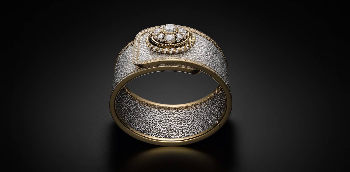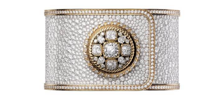 Pieza única. Botón de oro amarillo de 18 quilates adornado con un motivo bizantino engastado con 1 diamante talla cojín (1,5 quilates), 4 diamantes talla cojín (2 quilates), 4 diamantes talla pera (0,65 quilates) y 8 diamantes talla brillante (0,24 quilates) . Cordón exterior de oro amarillo de 18 quilates engastado con 52 diamantes talla brillante (0,46 quilates), cordón interior de oro amarillo de 18 quilates. Esfera en oro blanco de 18 quilates engastada con 142 diamantes talla brillante (0,52 quilates). Manecillas con acabado dorado. Brazalete rígido de oro blanco de 18 quilates engastado en la nieve con diamantes talla brillante de 1963 (39,88 quilates) y una moldura de oro amarillo de 18 quilates engastada con 316 diamantes talla brillante (4 quilates). Movimiento de cuarzo de alta precisión.