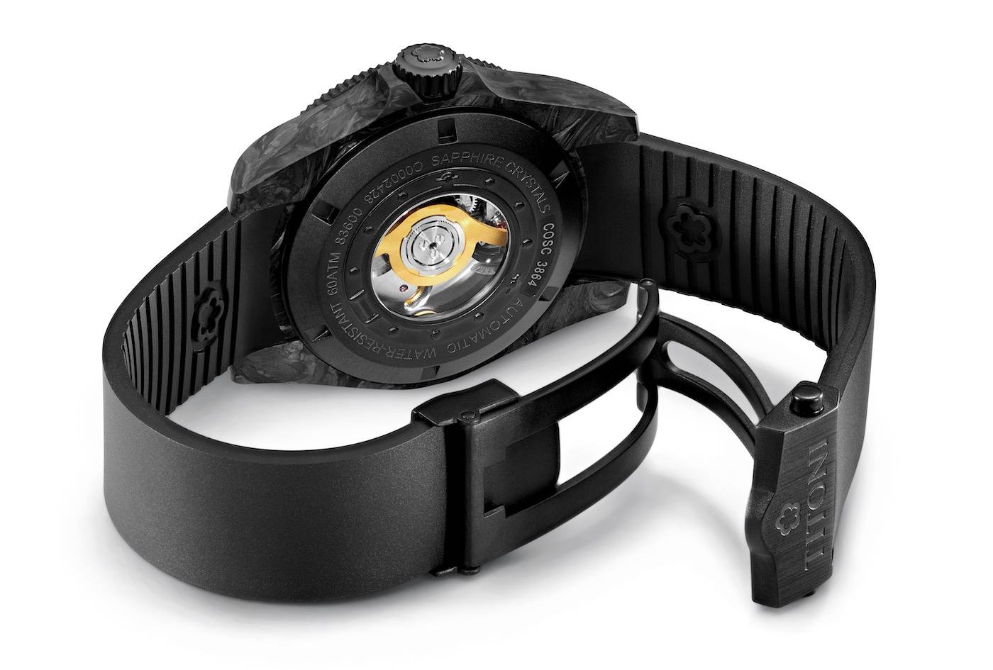 a combinación de carbono negro, que hace que cada reloj sea un original inconfundible, con el bisel de cerámica negra resistente a los arañazos es un punto culminante del diseño que le da al nuevo buceador de Titoni, el Seascoper 600 CarbonTech, un aspecto particularmente deportivo y moderno. El bisel pulido como un espejo contrasta con el acabado de carbono mate.