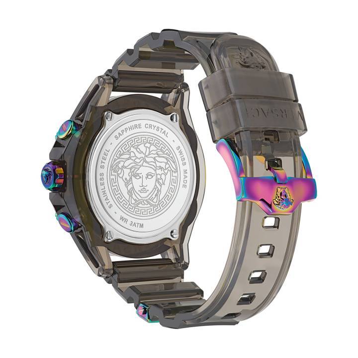 Caja: redonda, de policarbonato transparente, 44 mm Ø con motivo La Greca en negro, verde o arcoíris - Jaula IP Rainbow, IP Gun o IP Champagne con cuatro tornillos en el anillo superior. Movimiento: crono de cuarzo (5021.D) con fecha a las 6 en punto - Swiss Made. Esfera: negra, azul, rosa o azul claro con motivo Rainbow La Greca y cabeza de Medusa - Logotipo de Versace a las 12 en punto y detalles de colores. Correa: PU en negro transparente, azul, rosa o azul claro Patrón Rainbow La Greca - trabilla de metal y hebilla de lengüeta.