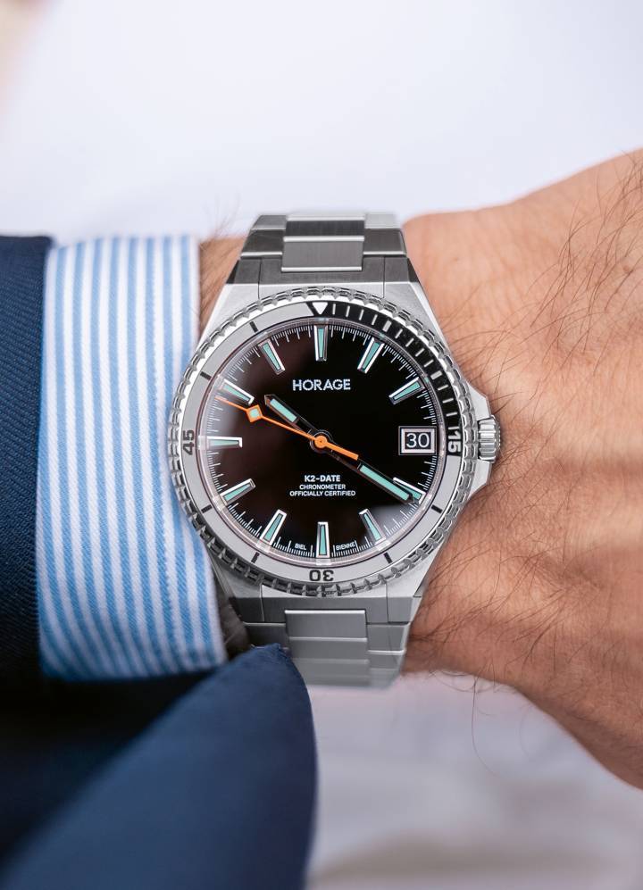 El Supersede Date funciona con el calibre K2 con certificación de cronómetro interno. A pesar de tener sólo 3,6 mm de grosor y estar propulsado por un solo cañón, el K2 ofrece más de 72 horas de reserva de marcha y puede equiparse con un rotor de tungsteno o platino. Gracias a la ciencia de materiales avanzada y a la tecnología patentada, Horage es uno de los primeros independientes en ofrecer una espiral, una rueda de escape y un ancla de silicio. La combinación mejora la eficiencia general del movimiento, el isocronismo y la resistencia a los campos magnéticos.