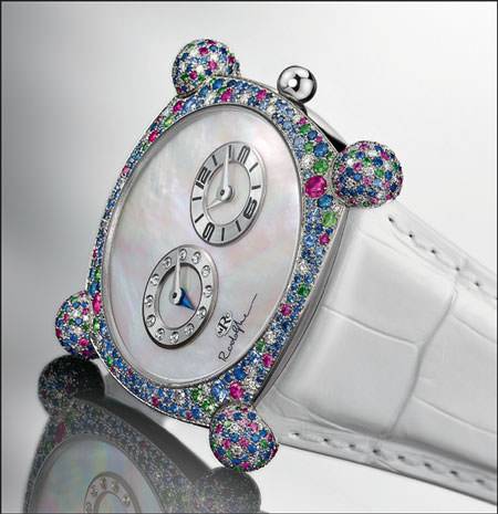 En el modelo presentado, Rodolphe Cattin'>Cattin da vida plena a esta creación mediante la adición de un colorido entorno de varios diamantes que juegan con el azul de los zafiros, con los rubies y las tsavoritas. Glamour puro y belleza en esta apacible pieza temporal para mujer. También se ha diseñado en varias otras propuestas.