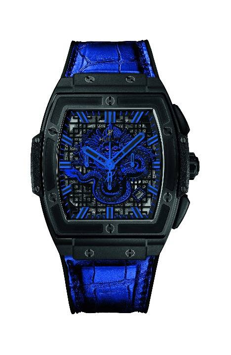 Al igual que el anterior modelo inspirado en Bruce Lee, éste también cuenta con el intrincado modelo del dragón en la esfera, sólo que esta vez es de color azul. La pieza de una edición limitada de 100 cuenta con la familiar caja tonneau en cerámica negra microblasteada. Está alimentado por el movimiento HUB 4700 - un movimiento esqueletizada de cuerda automática con una reserva de marcha de 50 horas. recordando una vez más la filosofía del agua de Bruce Lee, la correa es de piel de cocodrilo azul cosido en caucho natural.