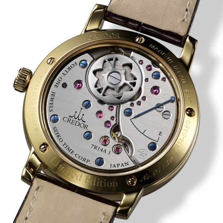 Los marcadores de hora, el logotipo de Credor en la posición de las doce en punto y las letras de Credor están pintados a mano por un artesano en el Micro Artist Studio, el taller de relojería de élite donde se fabrica el reloj. Después de cocer las esferas, se aplica oro sobre los elementos pintados a mano para crear una belleza cálida y multidimensional que sólo la artesanía del más alto nivel puede lograr. La técnica es un guiño al ’Ruri-Kinsai’, una forma famosa pero rara de artesanía tradicional que llamó la atención durante el período Edo, en la que se vidriaba oro sobre materiales de color ruri, como la porcelana. La ardua y altamente técnica aplicación del oro en la esfera de color ruri combinada con la caja de oro amarillo de 18 quilates crea una belleza única digna de un reloj creado para celebrar el 50 aniversario de Credor.
