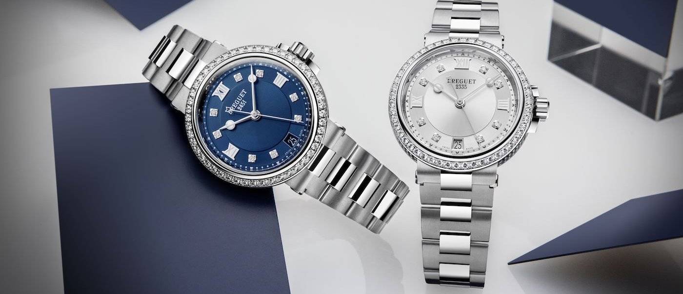 Como para evocar la luz del sol sobre el agua, ocho diamantes sustituyen a determinados índices en cada esfera, mientras que el bisel está adornado con 50 diamantes. Este modelo presenta varios de los atributos estéticos notables de Breguet. En primer lugar, las agujas de las horas y los minutos de oro facetado, que son luminiscentes y muestran el famoso estilo excéntrico de punta abierta. En referencia a las señales marítimas, la punta del segundero significa la letra “B” de «Bravo» en los códigos de navegación. A las 3 horas, la guarda de la corona se distingue por la forma ondulada característica de la línea Marine.