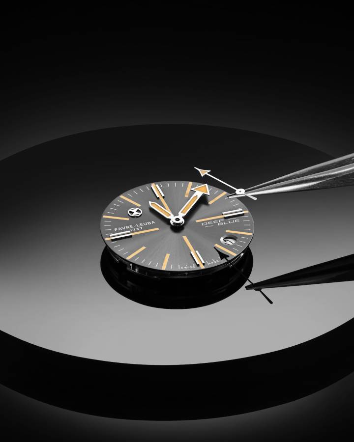 La caja, de 39 mm de diámetro y 12,75 mm de grosor, está diseñada y fabricada para una resistencia al agua de hasta 300 metros de profundidad, superando los 200 metros del modelo de los años 60. Todos los requisitos de un reloj de buceo profesional están marcados, incluido el bisel giratorio unidireccional para calcular y controlar los tiempos de inmersión sin paradas. Esta caja elegantemente delgada y robusta hace del Deep Blue Revival un compañero ideal para el buceador, ofreciendo una comodidad excepcional para la muñeca tanto por encima como por debajo del nivel del mar, en condiciones húmedas o secas. El fondo de caja sólido, grabado con el emblema «Favre Leuba 1737» y el reloj de arena, es idéntico al de su predecesor histórico.