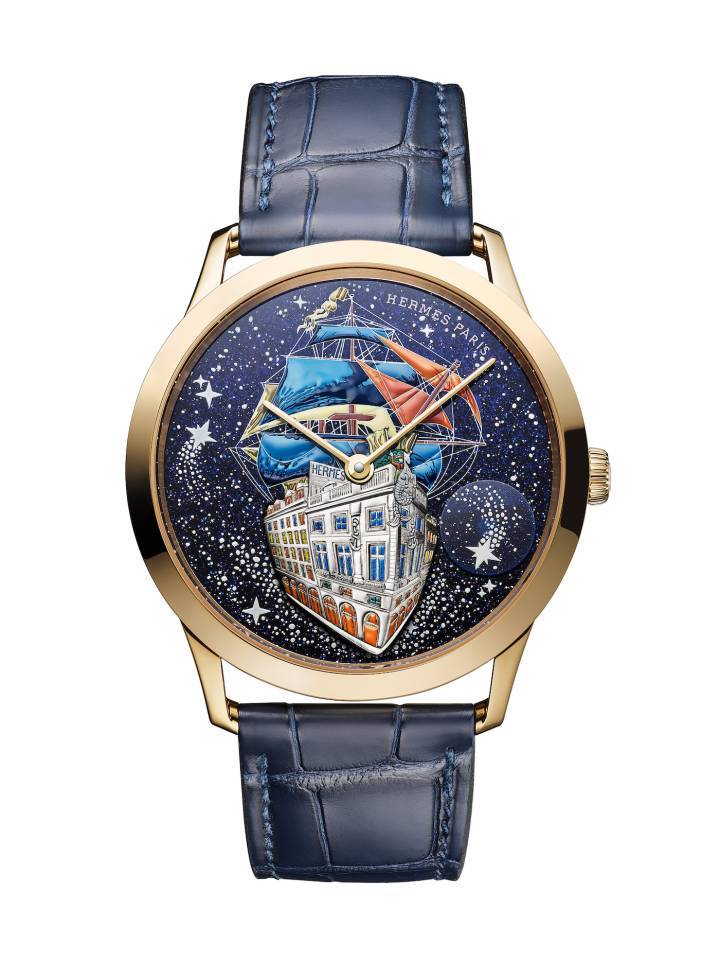 isto a través de un telescopio, el buque insignia de Hermès, cuyo casco está inspirado en la histórica boutique del número 24 de la rue du Faubourg Saint-Honoré en París, navega a través de la noche estrellada con su mezcla de pintura en miniatura y grabado. Su proa, que lleva la efigie del famoso fabricante de fuegos artificiales, y sus velas ondeantes cobran vida gracias a las virtuosas manos de los artesanos de Hermès.