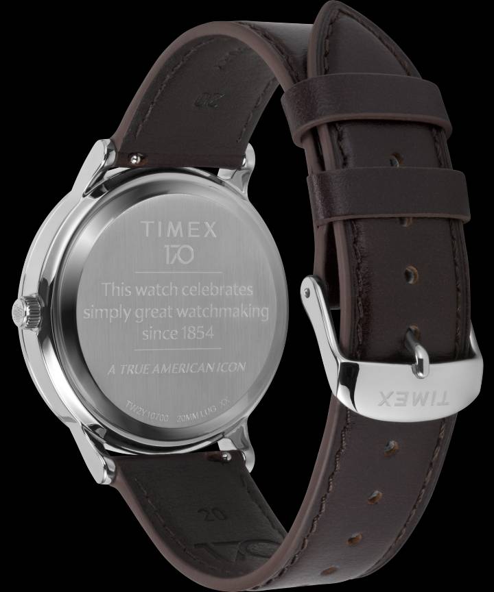 Este lanzamiento especial se suma a la querida colección Waterbury de Timex, rindiendo homenaje a sus orígenes como Waterbury Clock Company con superficies finamente terminadas y cuidadosas aplicaciones del ingenio relojero. Presenta una esfera blanca brillante con el logotipo oficial de la Edición del 170.° aniversario, realzado por marcadores de números romanos lacados en 3D. Dale la vuelta al reloj y descubrirás un fondo de caja especial mejorado con cepillado vertical y grabado con una conmemoración de este momento especial en la historia de la relojería de Timex.