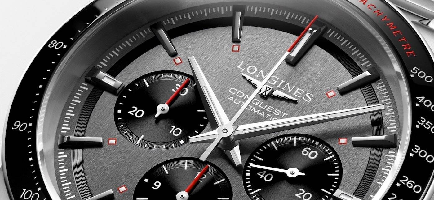 El Conquest Chrono Ski Edition, un reloj decididamente deportivo, presenta una caja de acero inoxidable de 42 mm con superficies pulidas y satinadas alternadas. Con su inserto de cerámica negra y bisel taquimétrico, este cronógrafo es hermético hasta 10 bares (100 m). Está rematado con un cristal de zafiro con tratamiento antirreflejos multicapa en ambos lados y presenta una esfera antracita que contrasta con una subesfera negra de pequeños segundos a las 3 horas y contadores negros a las 6 y las 9 horas. La esfera tiene un acabado externo acaracolado, un elemento de diseño emblemático de la colección.