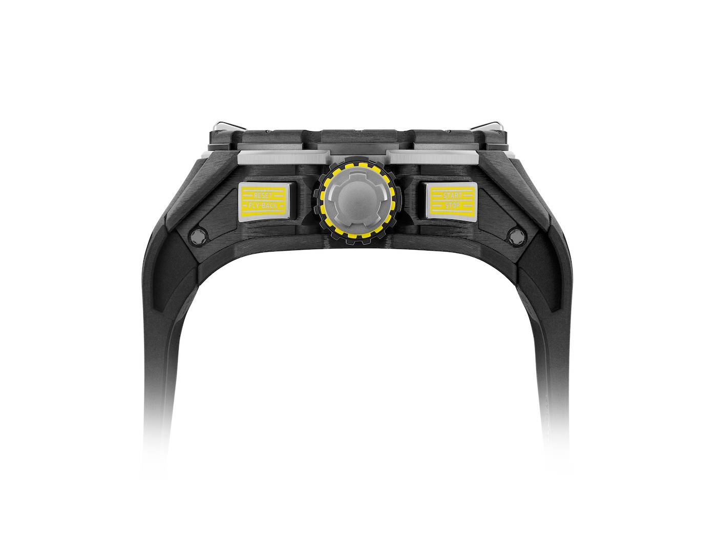 La seguridad y la legibilidad son lo más importante del RM 032 Ultimate Edition, creado específicamente para especialistas submarinos para garantizar la máxima resistencia. El reloj ofrece horas, minutos, segundos, totalizador de 12 horas y funciones de cronógrafo flyback, combinadas con un calendario anual con una fecha de gran tamaño a las 12 en punto y un indicador de mes entre las 4 y las 5 en punto. Los dígitos del indicador de fecha están compuestos por dos discos de titanio DLC, con números recortados en silueta como si fueran plantillas invertidas, combinando una gran claridad visual con estilo. Un indicador de funcionamiento a las 3 en punto permite verificar el correcto funcionamiento del movimiento en condiciones de estrés. El indicador de funcionamiento cuenta con un disco de Super-LumiNova, que gira a 2 rpm, ubicado debajo de segmentos negros delineados en la esfera, lo que garantiza una fácil lectura, tanto de día como de noche.