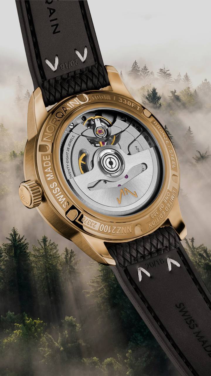- Puente personalizado con los valores fundamentales de Norqain: “Aventura – Libertad – Independencia”