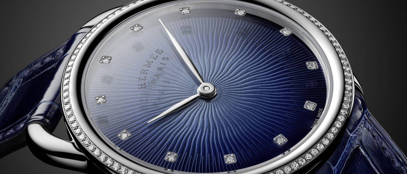 Imaginado por el artista Suizo Fred Rawyler para un pañuelo de seda, un diseño gráfico reluciente, reinterpretado para crear una profundidad y efectos de luz fascinantes, trae luz solar a la esfera del nuevo Arceau Soleil, acertadamente así llamado.