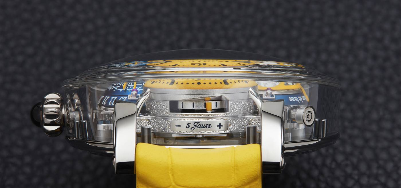 El nuevo Récital 26 Brainstorm® Chapter Two Sunshine está disponible en movimientos totalmente grabados a mano, todo en la caja monobloque Sapphire “Writing Slope” (47,8 mm). Cuenta con una esfera amarilla en forma de cúpula, revestida a mano por los artesanos de Bovet con un Super-LumiNova® (SLN) verde que le da a la esfera un acabado en polvo a la superficie.