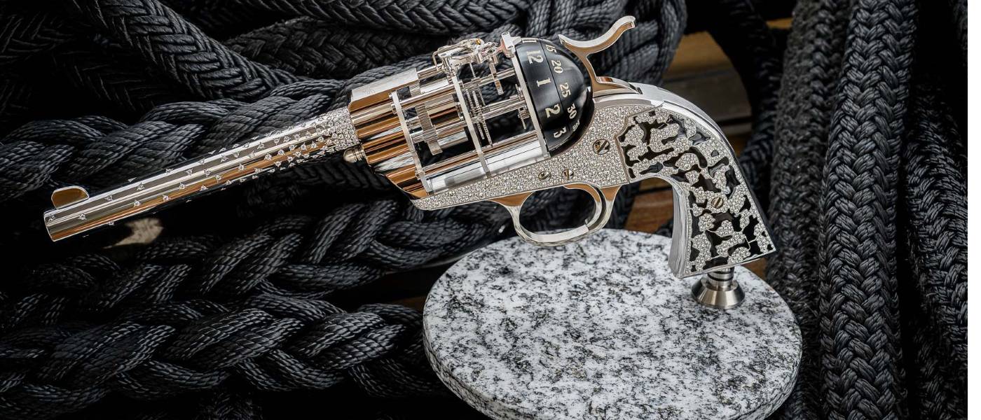 Es un reloj de mesa inspirado en un revólver, una forma singular de expresión para decir la hora: simboliza acertadamente la preciosidad de cada momento, la velocidad a la que puede ser robado. Nos recuerda, más vívidamente de lo que podría hacerlo una esfera de reloj convencional, la verdad atemporal de las palabras ’carpe diem.’