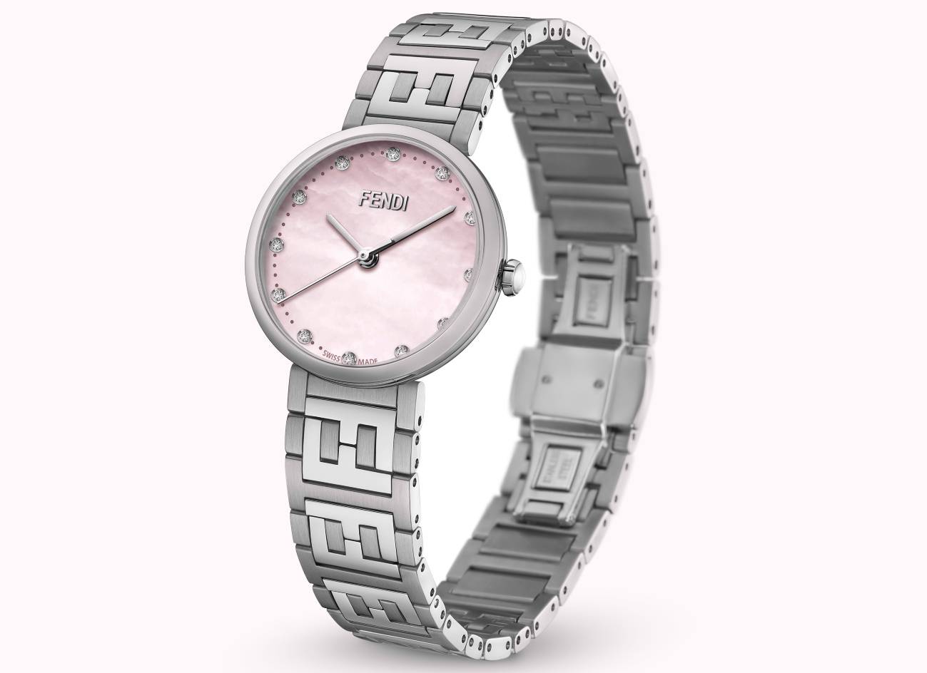 Añadiendo un toque precioso a la colección, el exclusivo reloj Forever Fendi está adornado con una esfera de nácar rosa genuino con marcadores horarios de diamantes que deslumbran en una caja de acero inoxidable de 29 mm o de acero inoxidable y oro rosa de 19 mm y 29 mm. , enriquecido aún más por un bisel engastado con 62 diamantes.