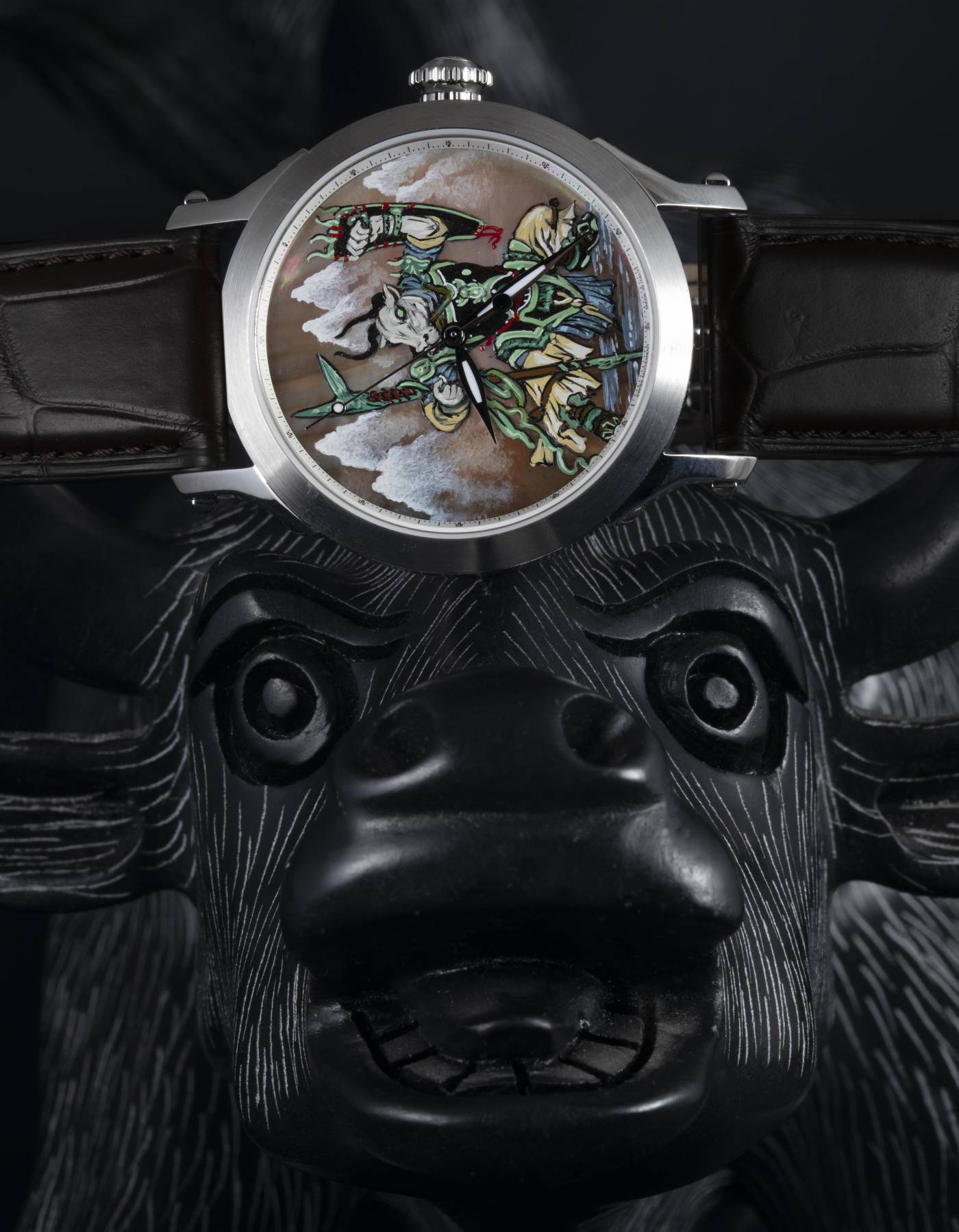 Vigoroso y combativo, un modelo representa al buey de cuernos grandes y fuertes, mientras que el otro está diseñado con actitud beligerante y listo para la acción. En este escenario, tres agujas luminiscentes están girando, impulsadas por un preciso movimiento de cuerda automática.
