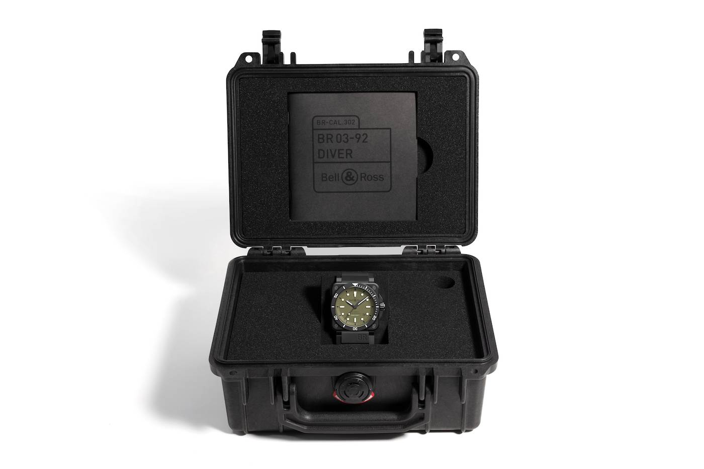 El BR03-92 Diver Military viene en una caja Pelican® resistente al agua y con dos correas: la primera está hecha de caucho negro tejido con una hebilla de pasador de acero inoxidable recubierto de PVD. La segunda es de un tejido sintético verde oliva ultrarresistente, que permite ajustar el reloj de forma rápida y ergonómica sobre el traje de buceo gracias a un sistema de cierre de velcro. Ambas han sido diseñados para un uso profesional bajo el agua y su estilo evoca instantáneamente las profundidades del océano.