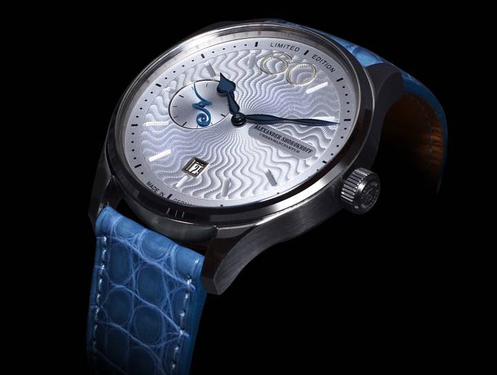 Como en el modelo anterior, el guilloché ondulado de la esfera superior juega el papel principal. La esfera inferior proporciona el contraste y lleva el logo de Alexander Shorokhoff, tanto en los marcadores de los minutos como de los segundos. No debe olvidarse el pequeño segundero curvo de color plateado en la posición de las 9 en punto, que tiene la forma de la letra “N”, en referencia al nombre del reloj. Las agujas plateadas de las horas y los minutos crean el contraste necesario con el verde intenso.