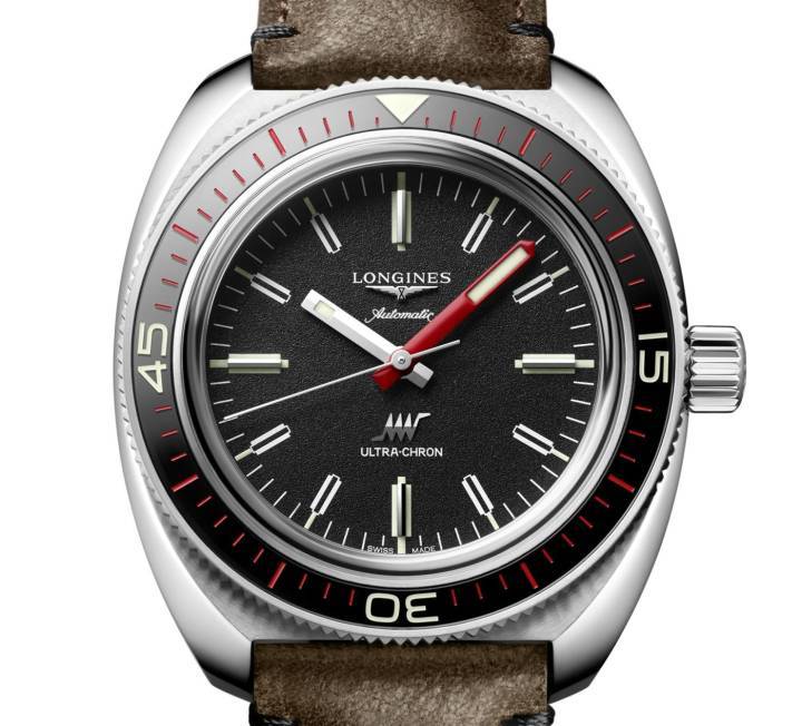 El nuevo Longines Ultra-Chron está inspirado en los códigos estéticos y en las funciones de buceo profesional del modelo de 1968. Cuenta con un bisel giratorio unidireccional, así como con un fondo de caja y una corona atornillados. También ofrece una gran legibilidad y es resistente al agua hasta 30 bar (300 metros). Su caja de acero con forma de cojín de 43 mm, reconocible al instante, está equipada con un bisel de buceo que cuenta con una inserción de zafiro con detalles luminiscentes. La llamativa esfera graneada negra presenta una pista de minutos blanca con bastones alternados revestidos con Super-LumiNova y apliques chapados en rodio.