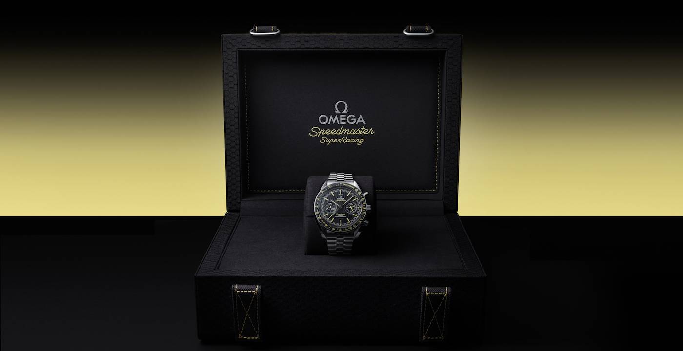 El hogar fuera de la muñeca para el coleccionable de Omega es una caja de reloj Speedmaster con patrón de panal en negro con costuras amarillas. La caja de presentación especial incluye la correa NATO de naylon reciclado y una herramienta para cambiar la correa.