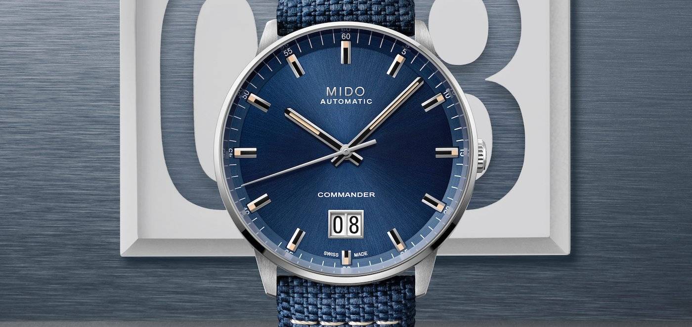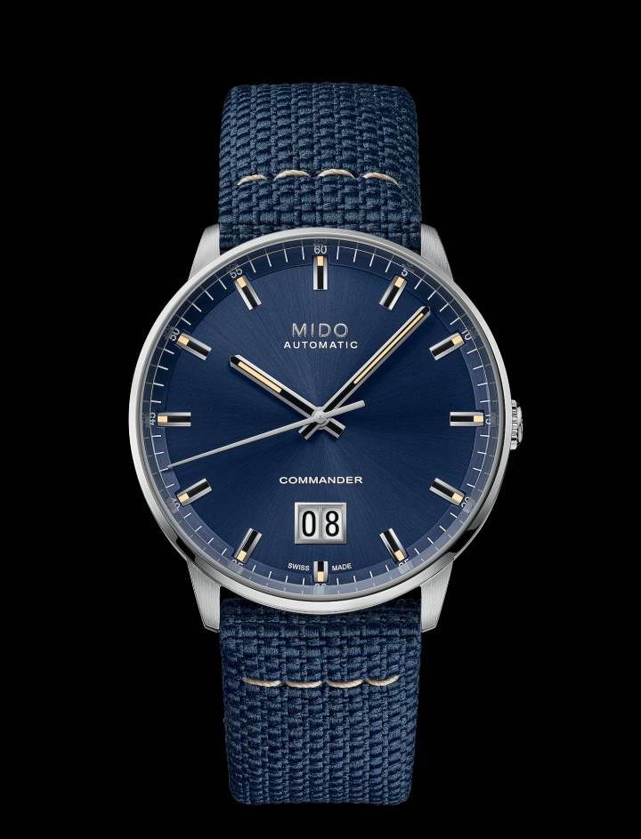 l nuevo Commander Big Date de Mido sabe jugar con colores y texturas con clase. La esfera azul intenso con acabado satinado de rayos de sol se combina perfectamente con los índices pulidos brillantes, las manecillas planas con corte de diamante, la apertura de la fecha y la caja redonda de 42 mm de diámetro en acero inoxidable con acabado satinado, completa con bisel pulido y bordes de la caja con acabado satinado y agarradera.
