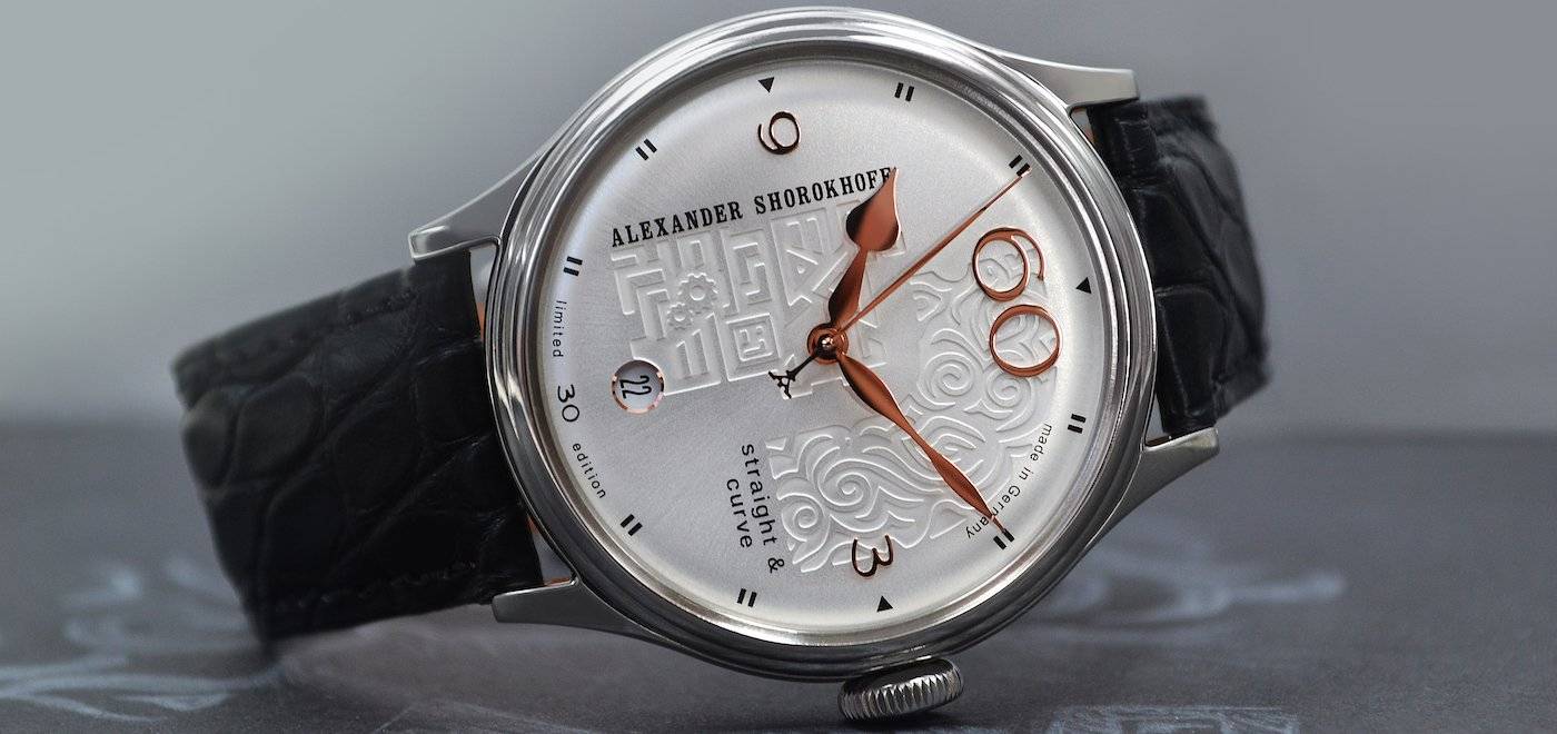 El modelo combina líneas rectas con curvas en un aspecto armonioso. Inconscientemente marcan el tono de este elegante reloj automático. Los patrones de líneas curvas serpentean para coincidir con la forma de la esfera en el área superior derecha de la esfera, mientras que las líneas rectas encuentran su lugar a la izquierda de las letras de Alexander Shorokhoff.
